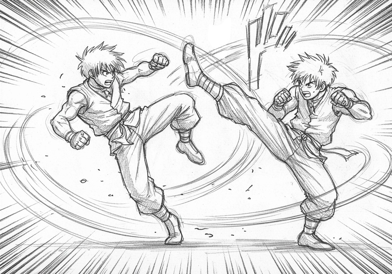 - パンチやキックが「その瞬間」だけ描かれていて、「前後の流れ」が見えない
